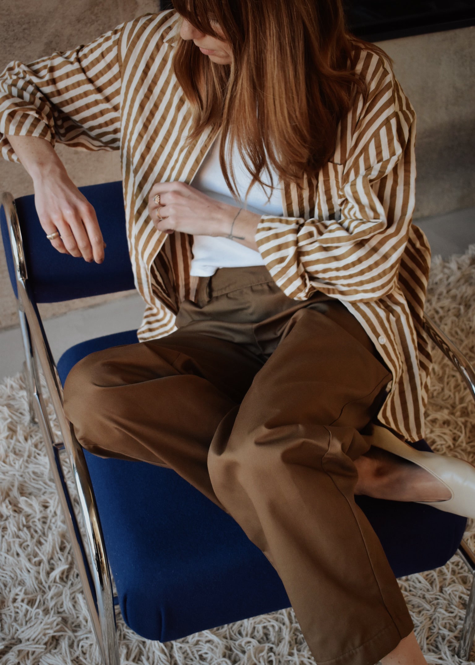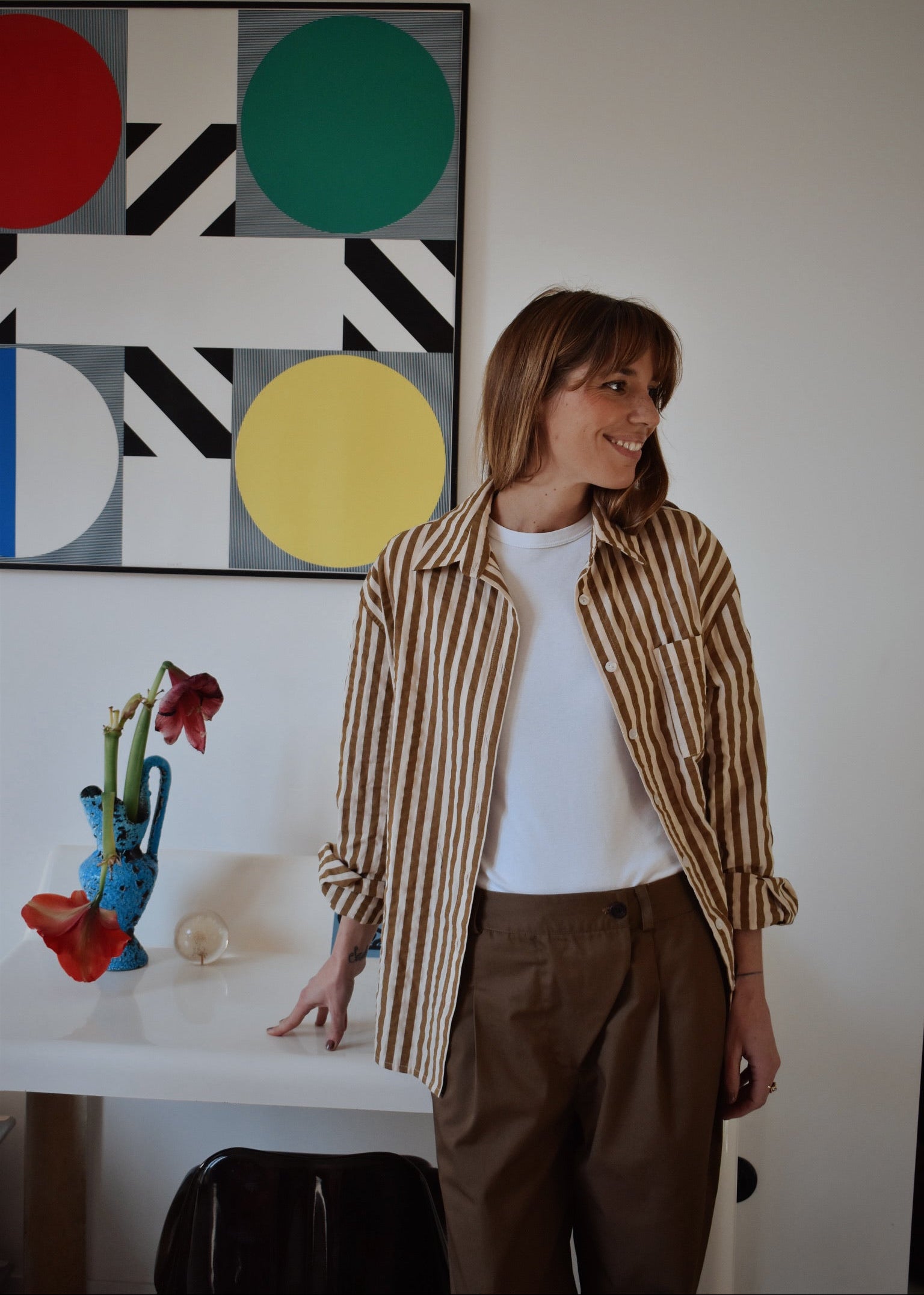 La chemise Rita se décline ici dans une version rayée intemporelle, aux tons chauds et naturels.