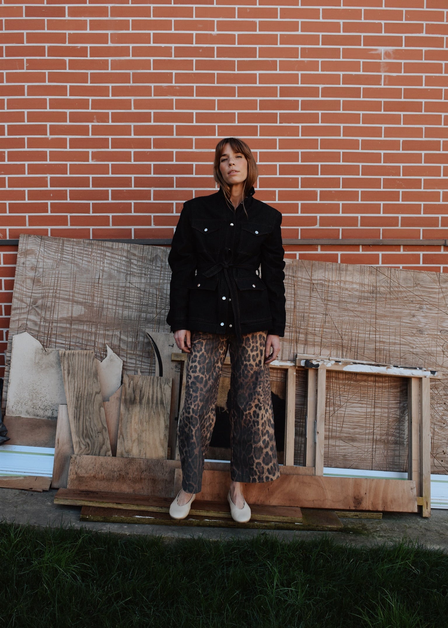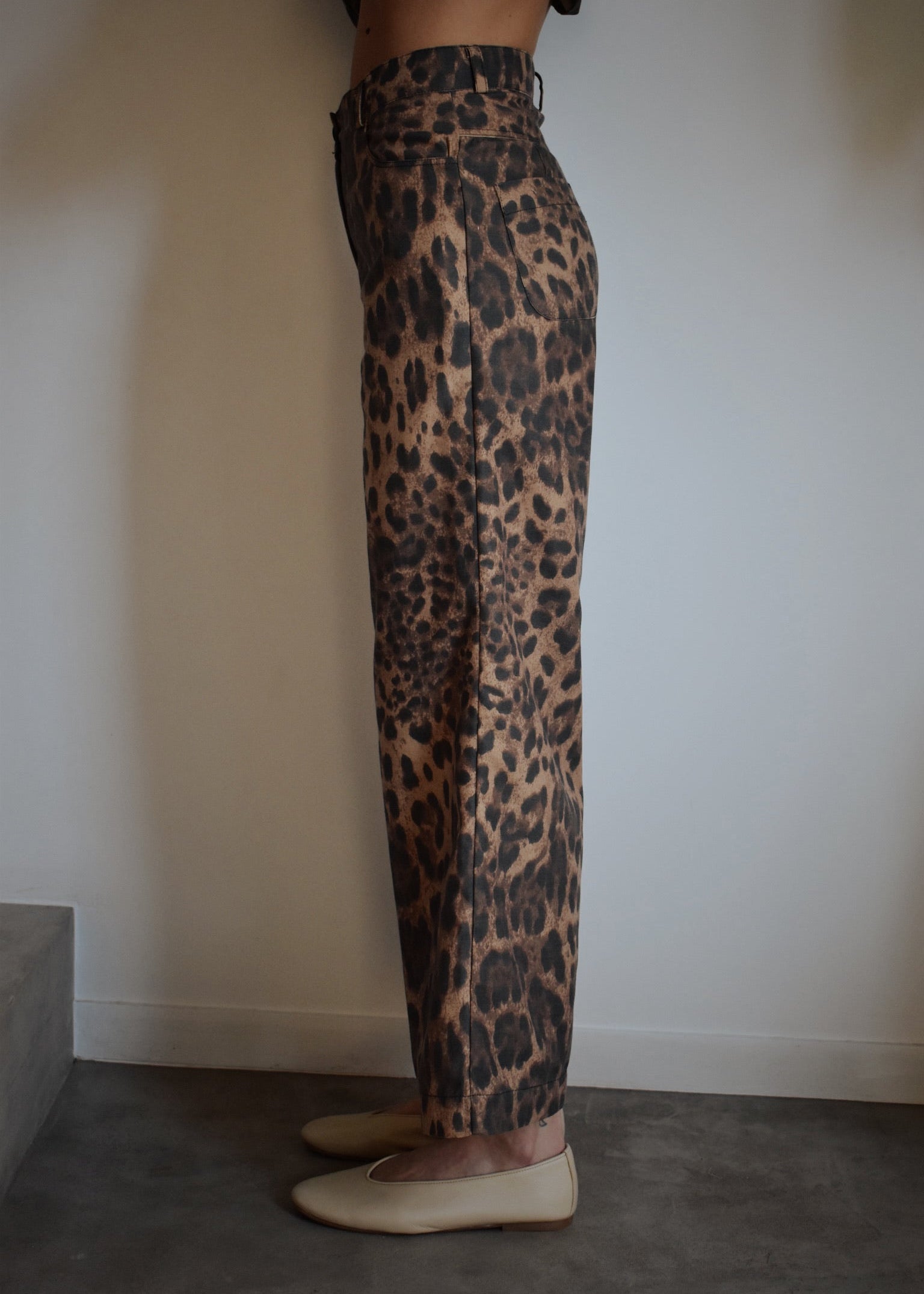 Le pantalon Sasha affirme la silhouette avec son imprimé léopard développé en exclusivité par nos soins.