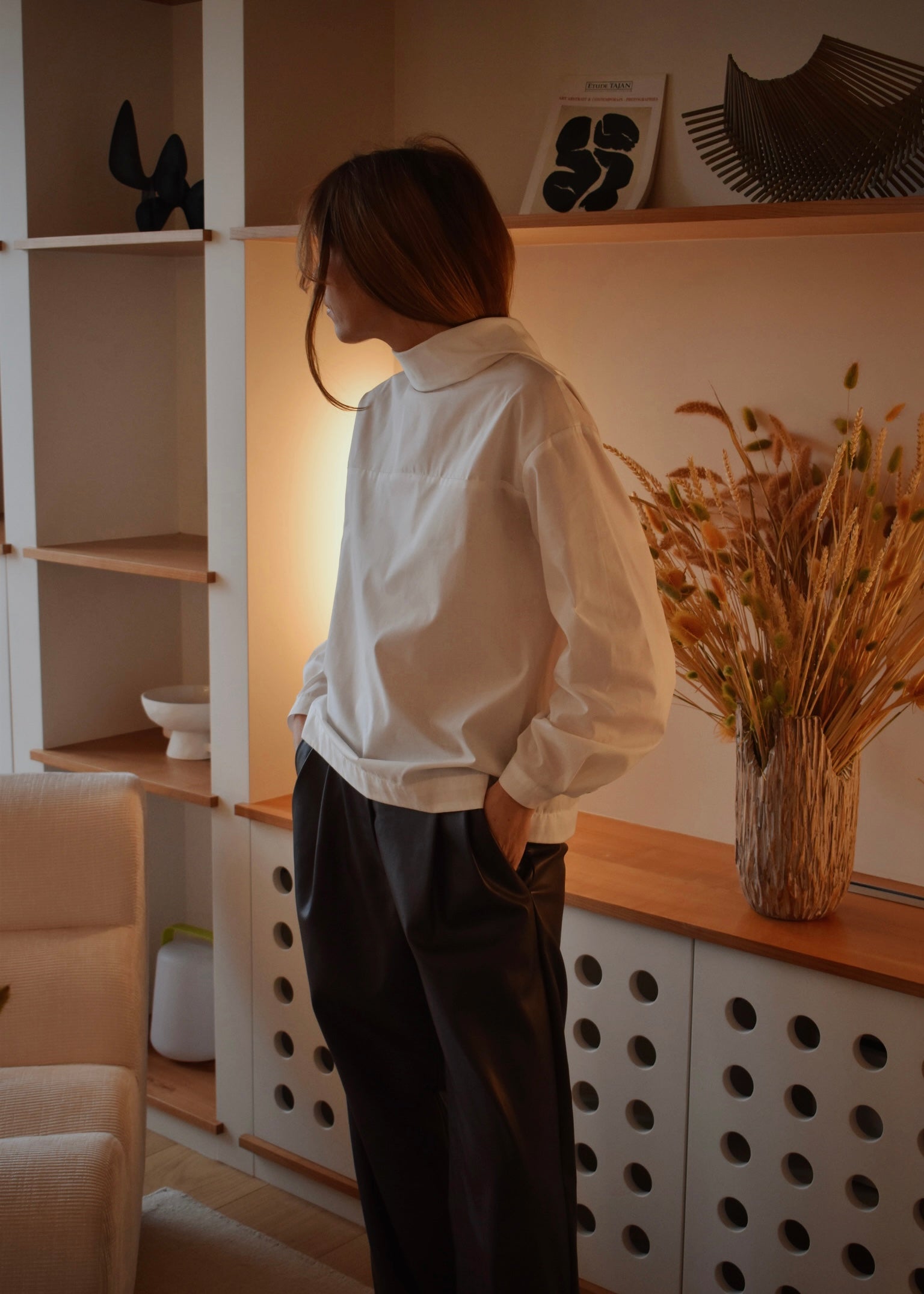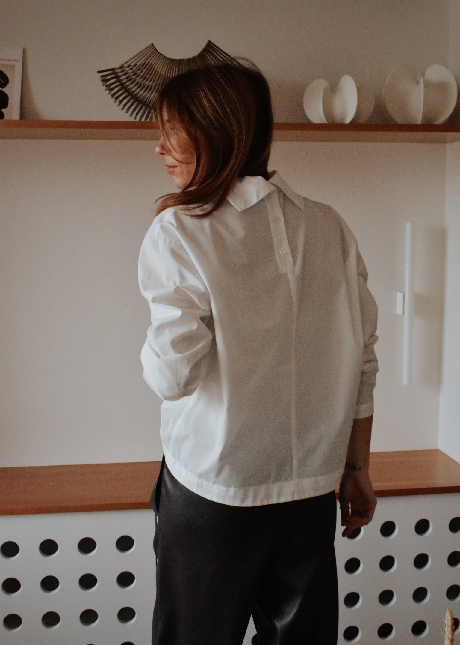 D’un côté, une allure épurée avec un col net et structuré. De l’autre, un détail de boutons au dos qui apporte une touche plus graphique et inattendue. Sa coupe droite et son coton léger en font une pièce confortable, facile à porter au quotidien.