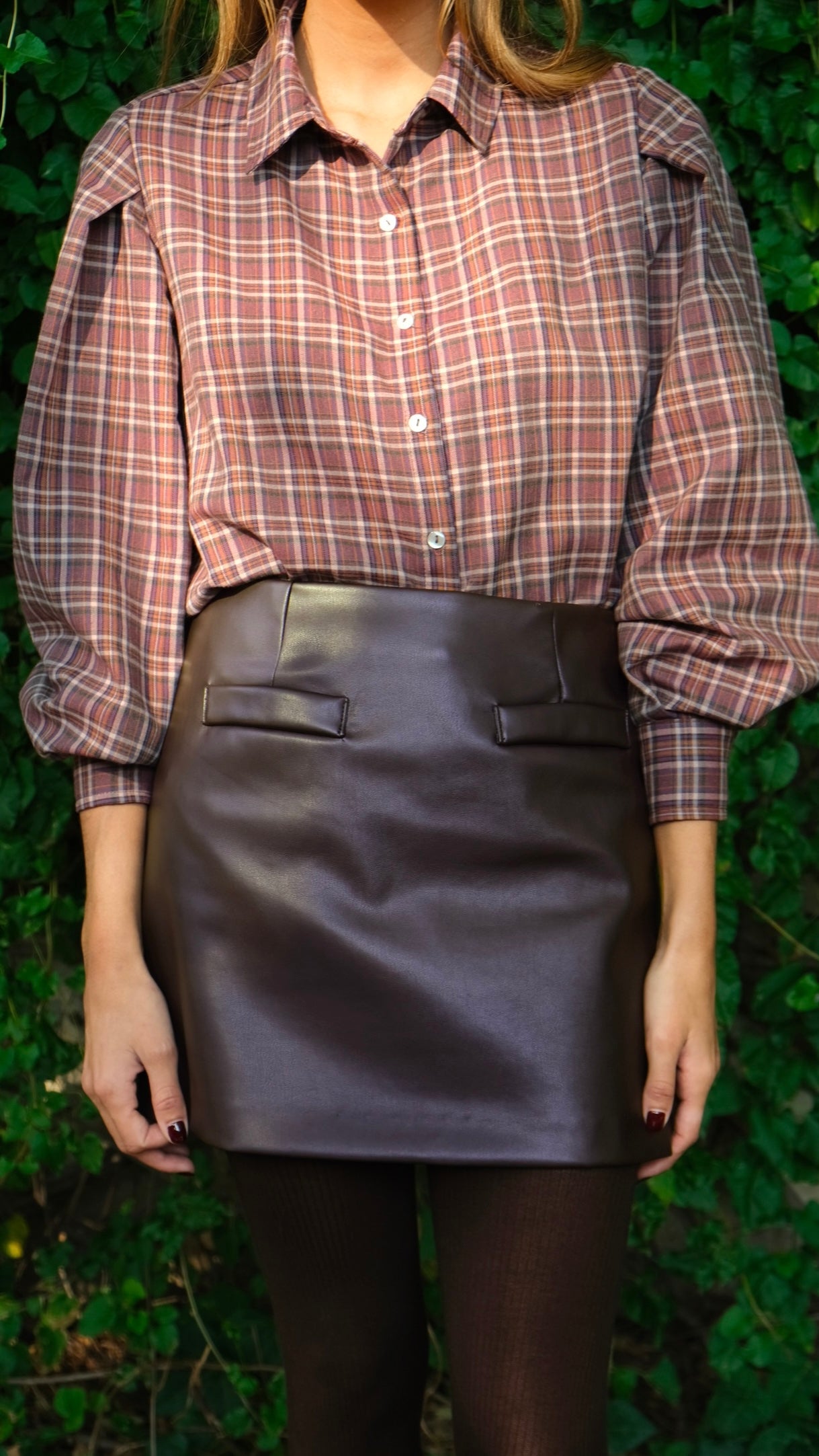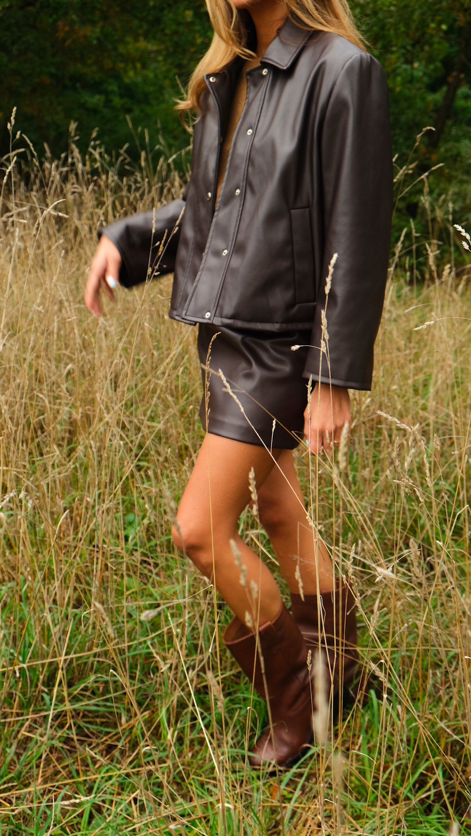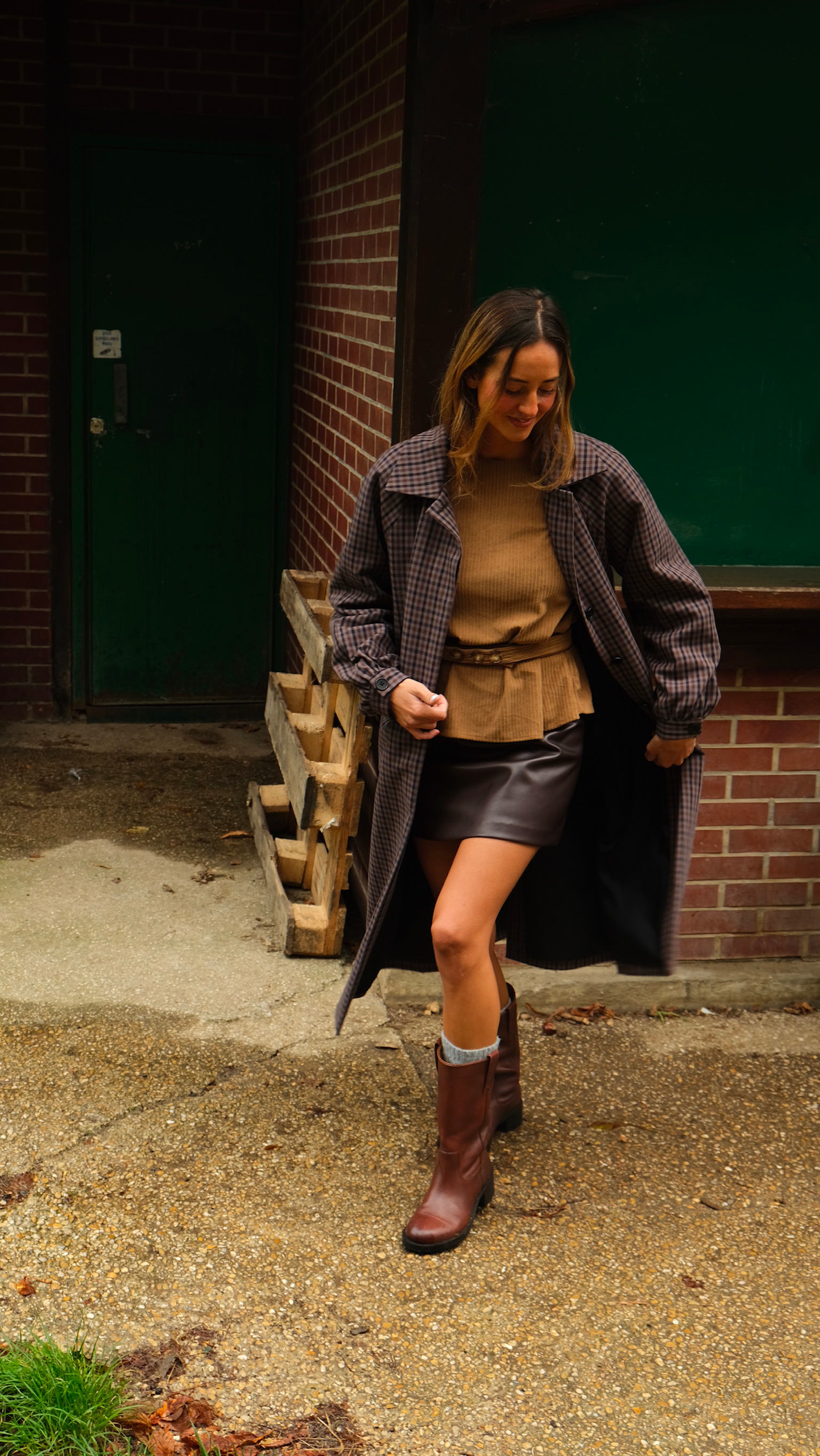 La jupe Jeanne complète l’ensemble en simili cuir recyclé avec une allure féminine et moderne. Elle séduit par sa coupe légèrement trapèze et sa taille middle. Ses deux fausses poches plaquées à l’avant apportent une touche graphique, tandis que sa fermeture invisible au dos assure une finition élégante.