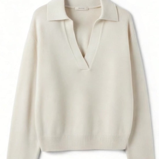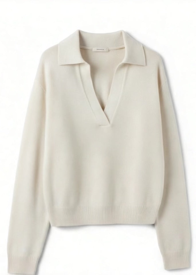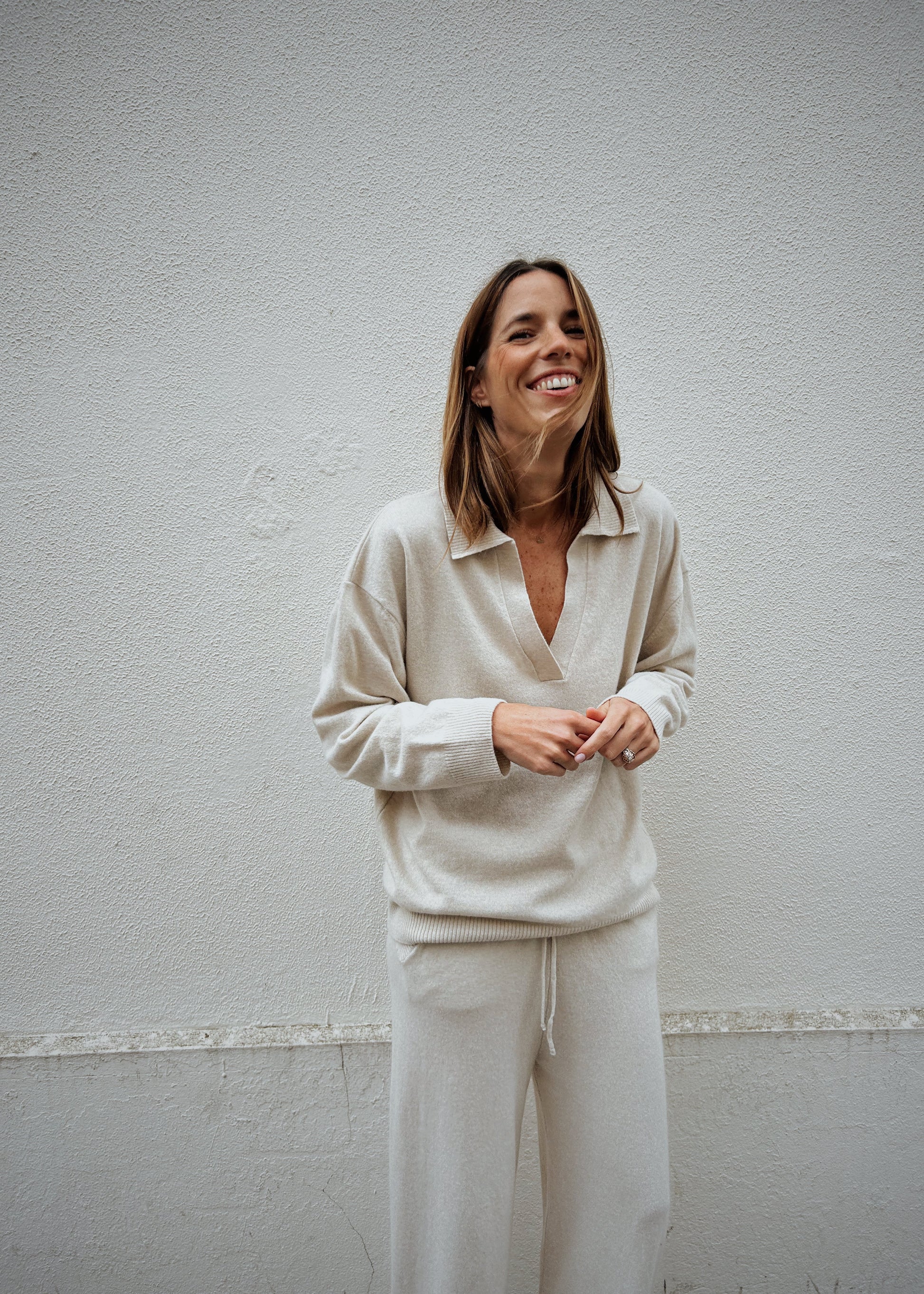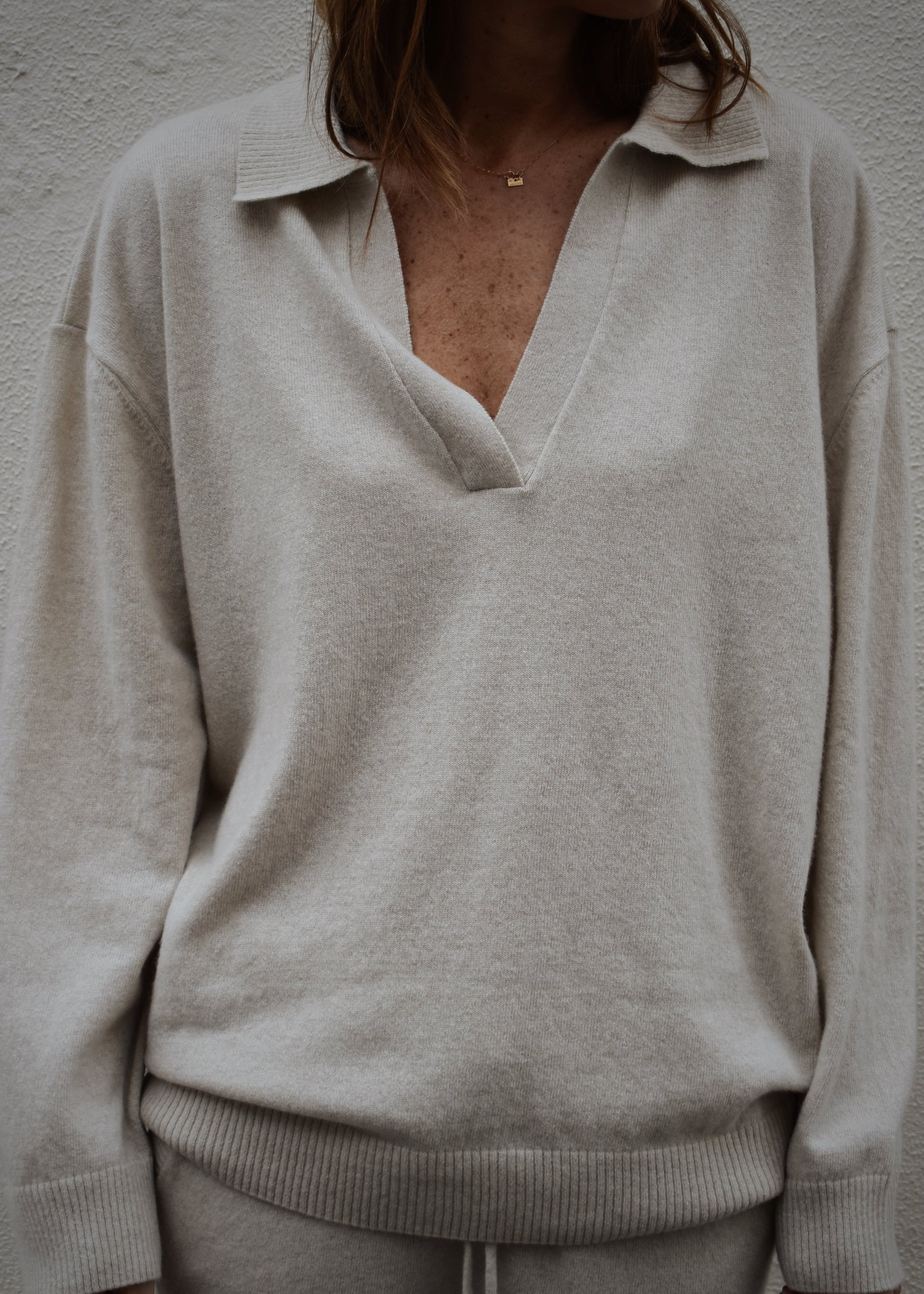 Coupe droite et oversize, col polo ouvert sans boutons pour une allure naturelle et féminine.
