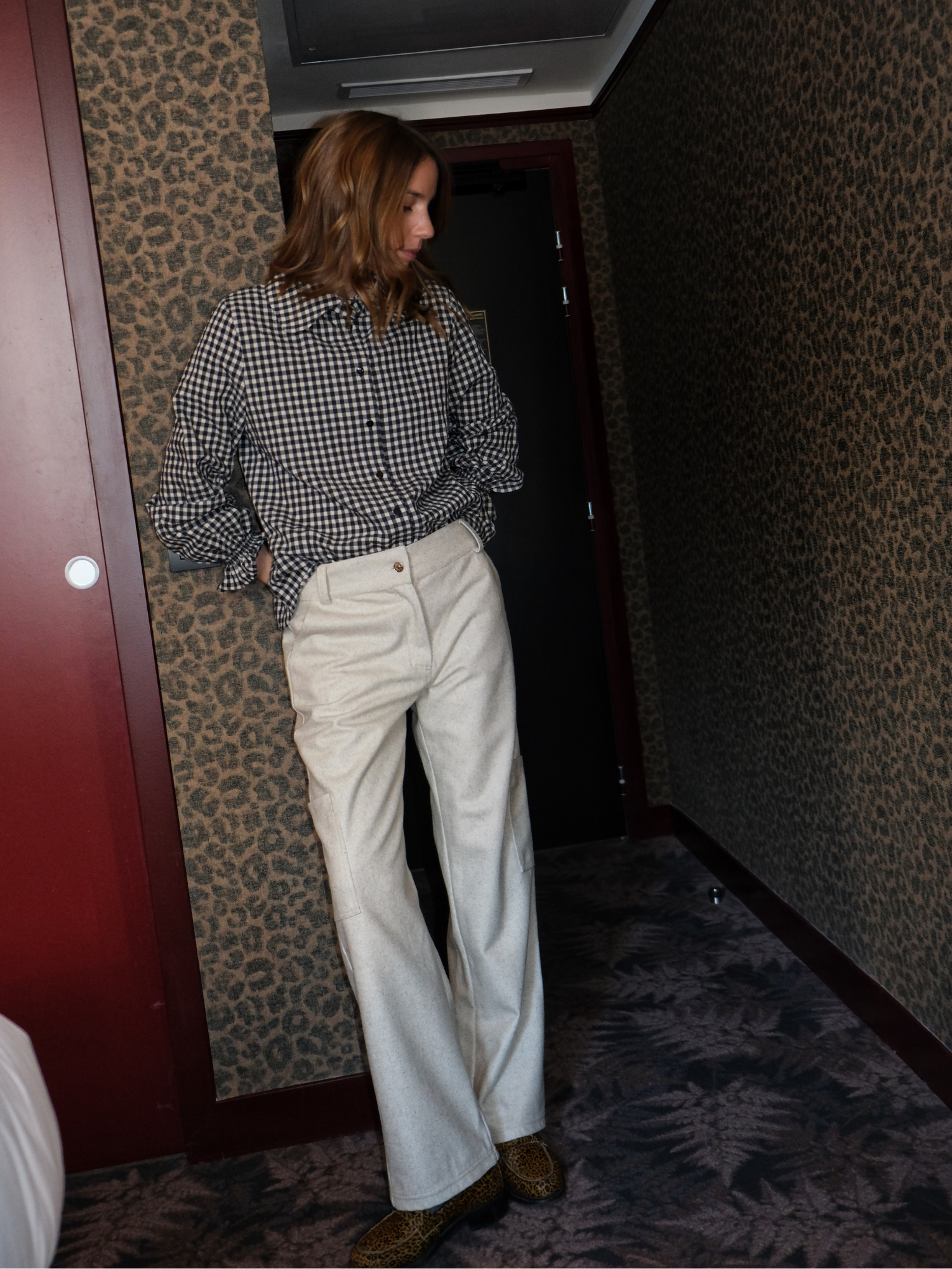 Le pantalon Basile revisite la coupe baggy avec une touche féminine et élégante. Sa silhouette ample, parfaitement maîtrisée, offre un confort moderne. Décliné en deux versions – un écru moucheté en laine et un denim noir – il s’adapte à toutes les occasions. Ses grandes poches latérales, à la fois pratiques et stylées, ajoutent une note utilitaire sans compromettre le style