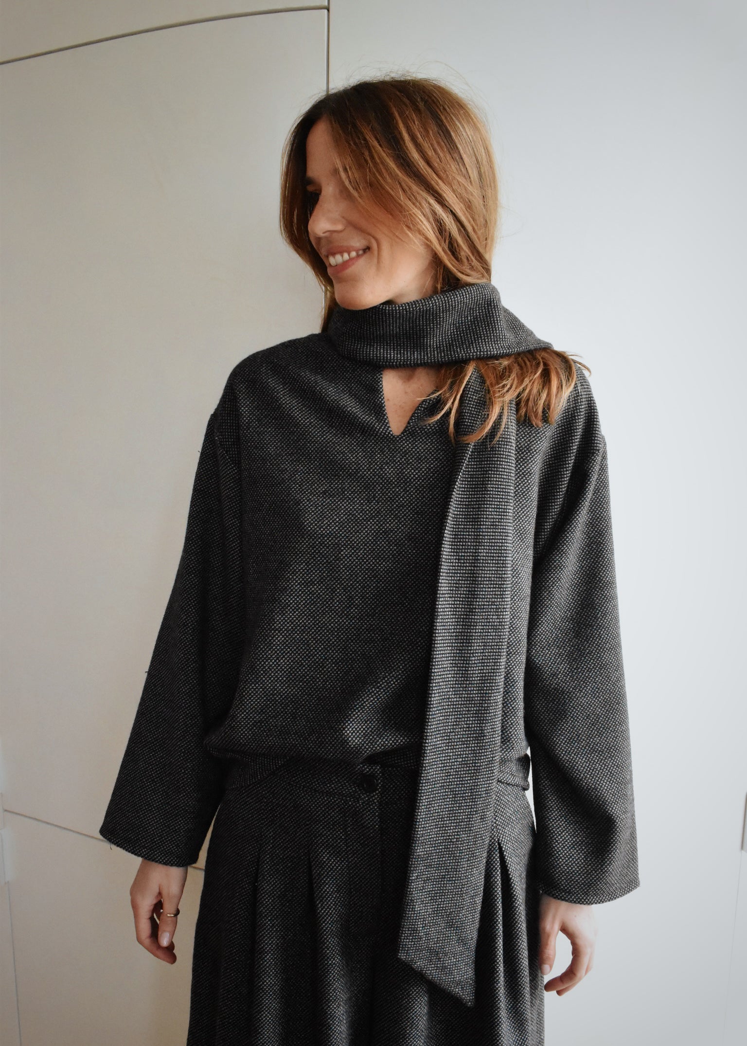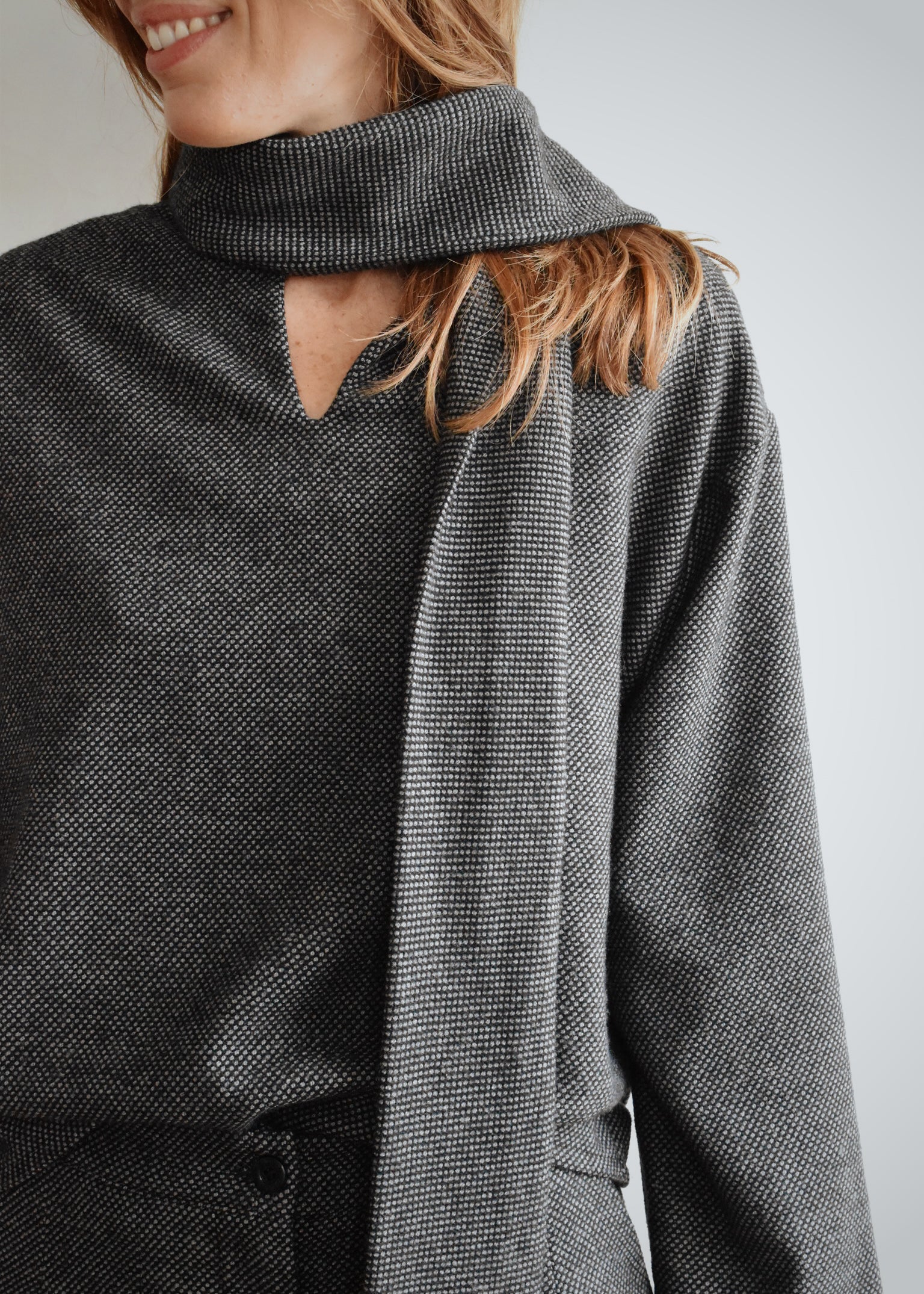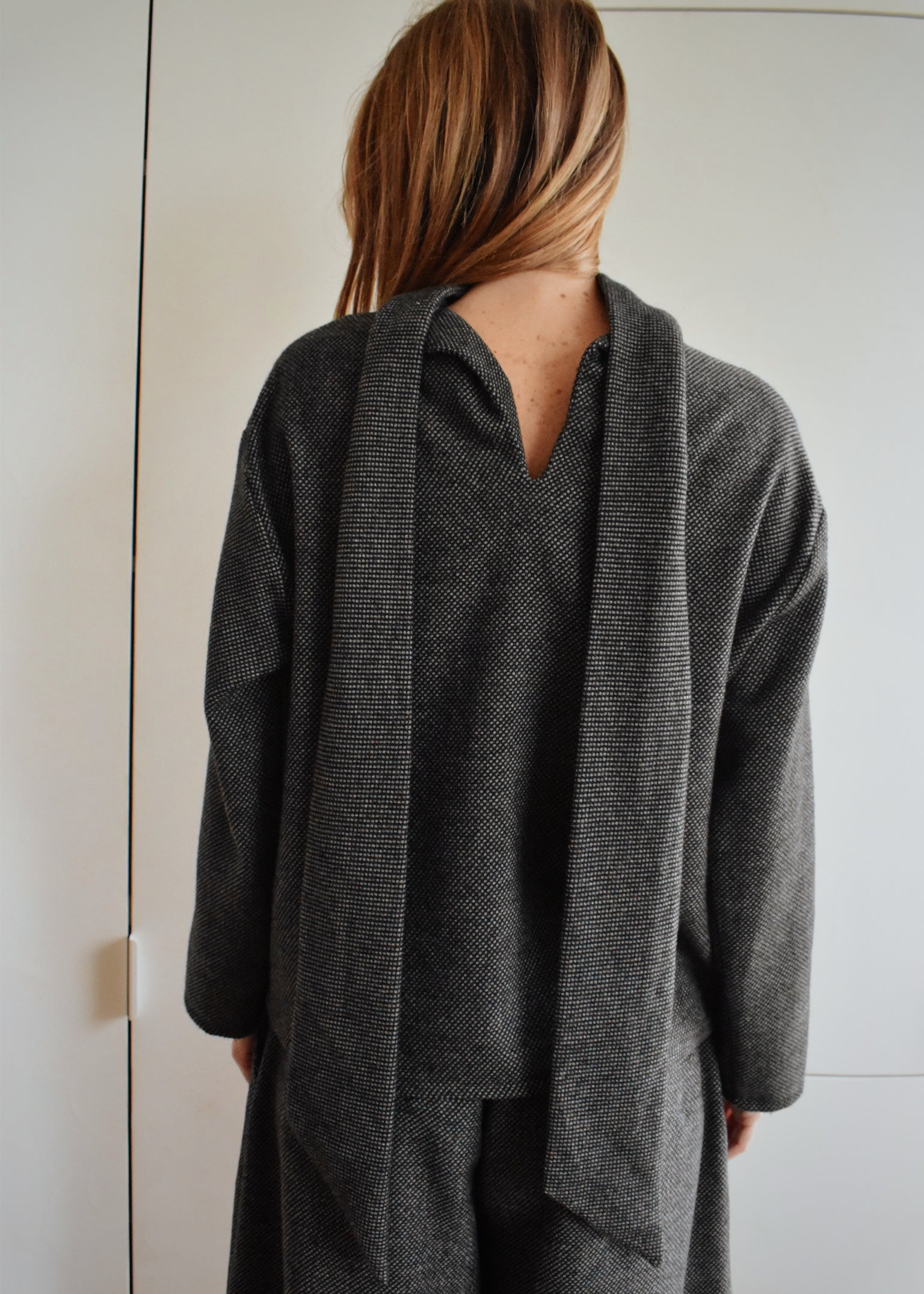 D’un côté, un col montant élégant souligné par une longue écharpe intégrée. De l’autre, une encolure en V dans le dos pour une silhouette plus féminine et inattendue. Sa coupe droite et confortable en fait une pièce facile à porter, seule ou en total look.