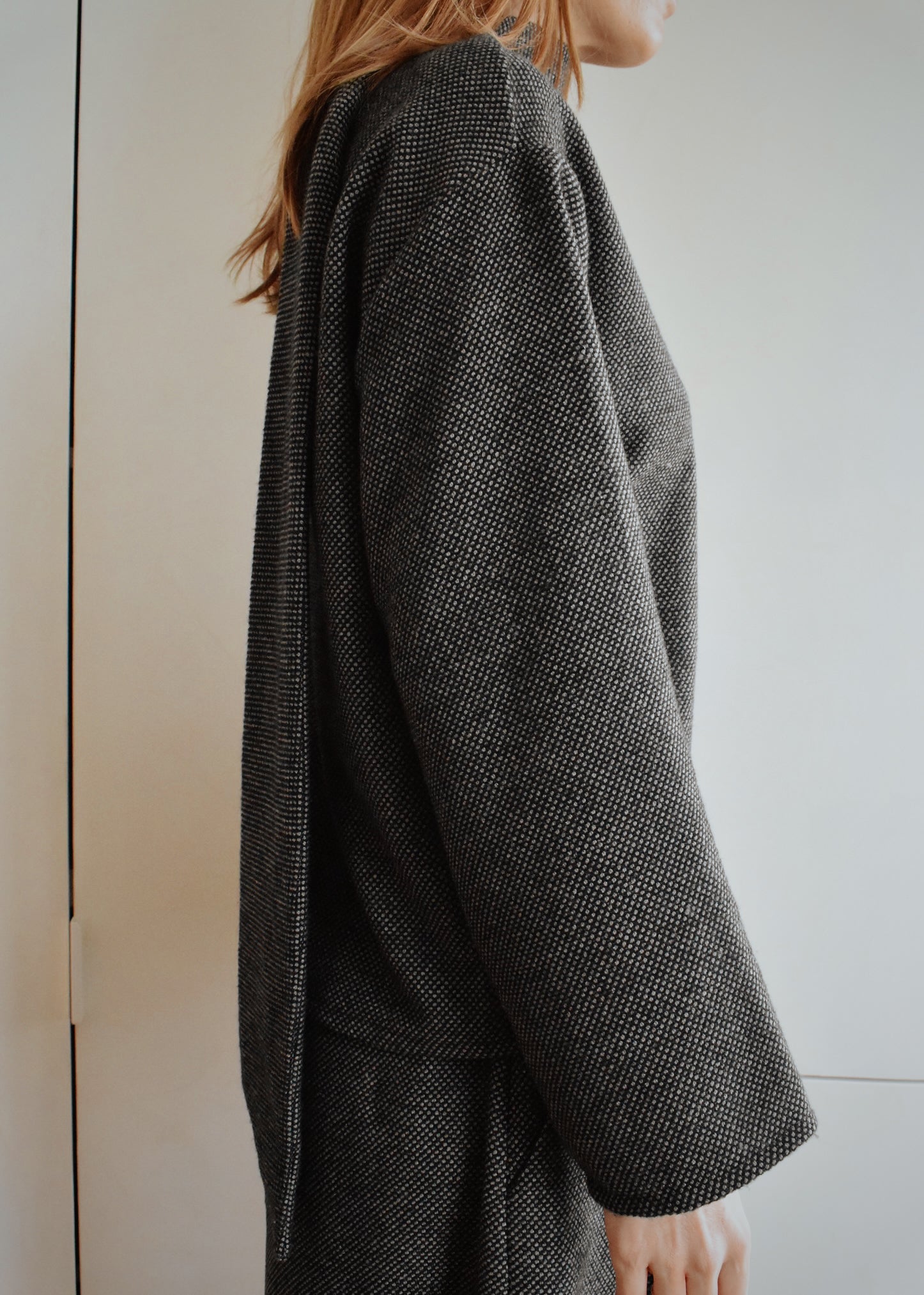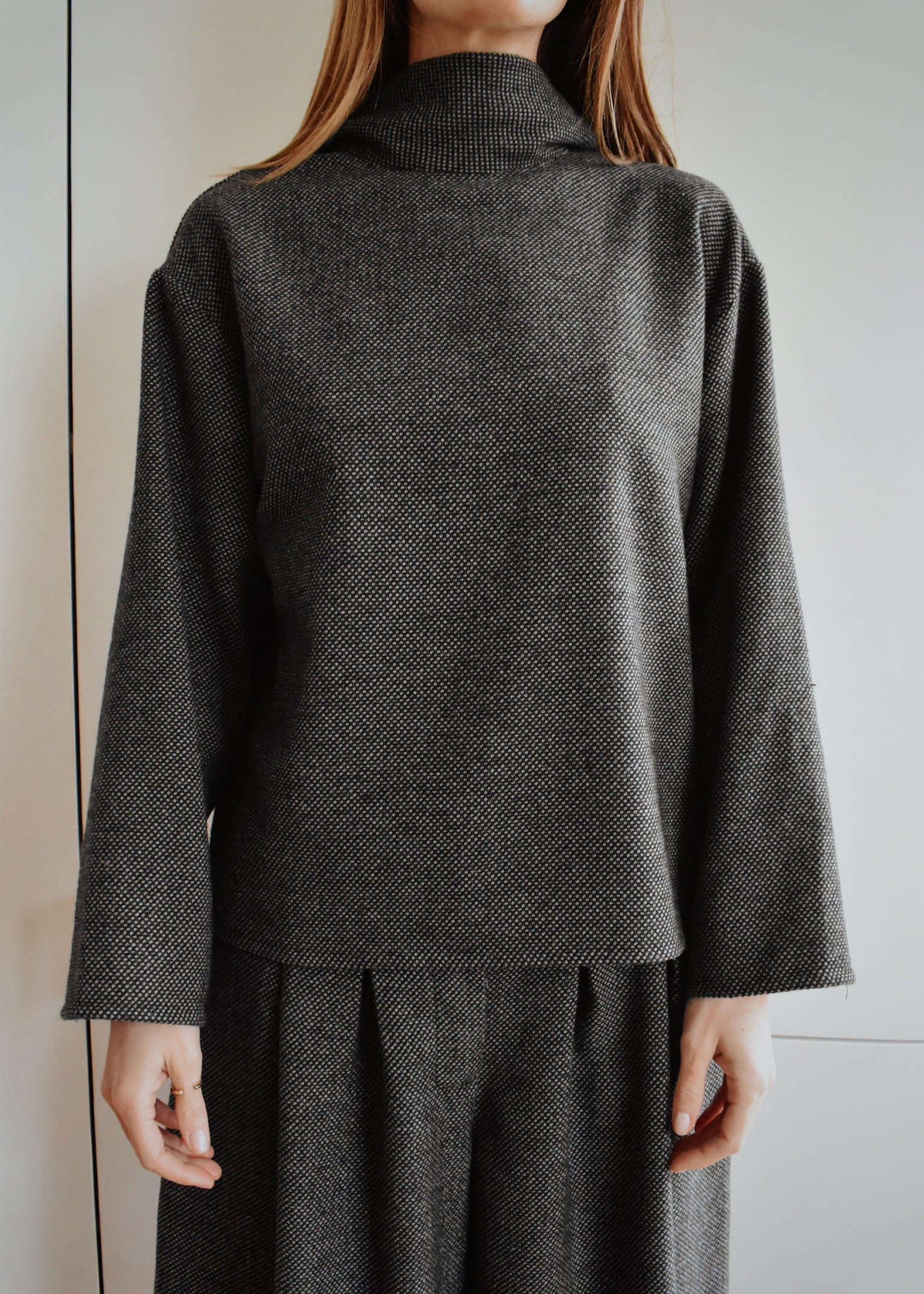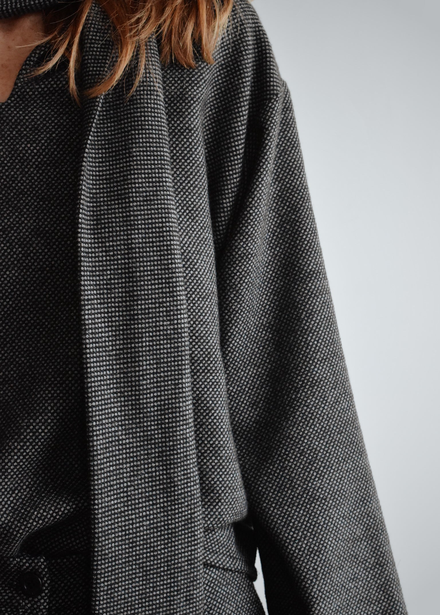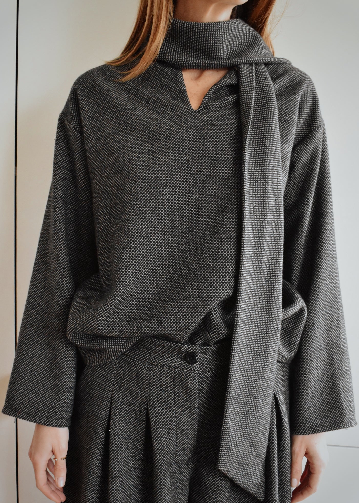 D’un côté, un col montant élégant souligné par une longue écharpe intégrée. De l’autre, une encolure en V dans le dos pour une silhouette plus féminine et inattendue. Sa coupe droite et confortable en fait une pièce facile à porter, seule ou en total look.